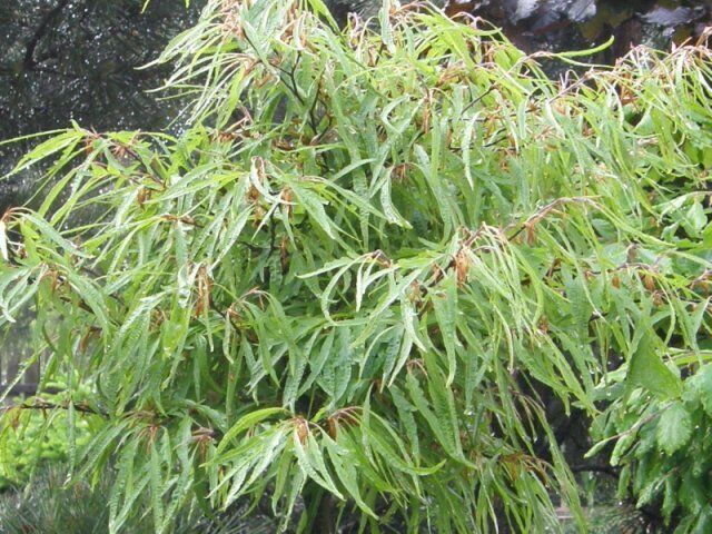 Листья удлиненно-заостренные, по форме близки к ивовым. Их окраска зависит от времени года: летом - зеленая, осенью - желтая.