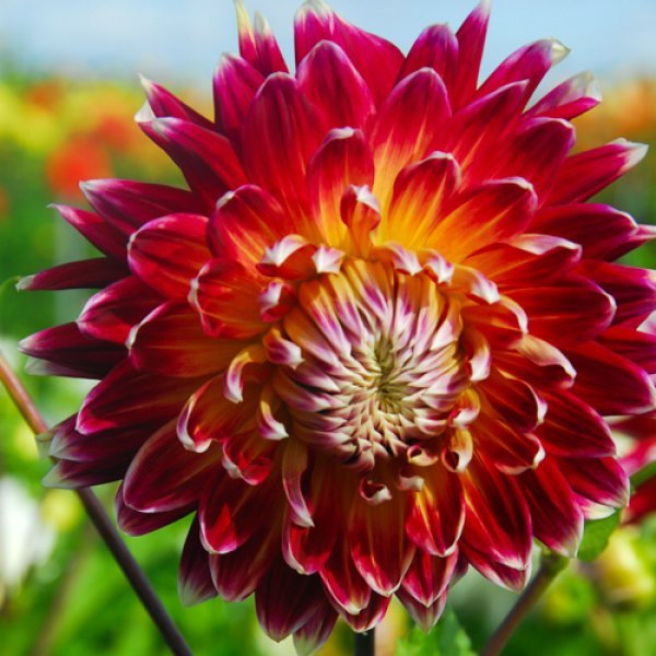 Клубни георгины махровой Акита (Dáhlia variabilis Akita) позволят вырастить на приусадебном участке куст, который с июля по сентябрь будет радовать цветами диаметром от 10 до 12 сантиметров. Цветы поражают необычной расцветкой. Основной тон лепестков красный, края украшены едва заметной белой каймой. Поэтому издали кажется, что они покрыты серебристым налетом. Высота куста достигает от 60 до 100 сантиметров. Растения высаживают одиночно или группами, их используют для создания миксбордеров. Кусты подвязывают к опоре, иначе стебли могут падать на землю под тяжестью цветков.