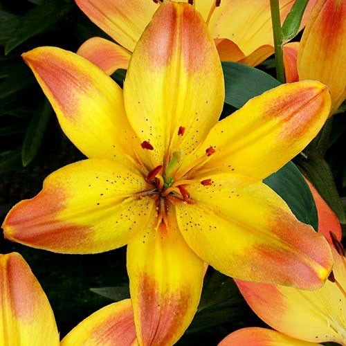 Луковицы лилии азиатской Хэппи Мемориз (Happy Memories) принадлежат к группе низкорослых сортов, пригодных для выращивания в горшках. На стебле, высотой 40 сантиметров, раскрываются крупные цветки оранжевой окраски с желтыми пятнами по центру лепестка. Длинные темные тычинки подчеркивают изящество и красоту лилии.
