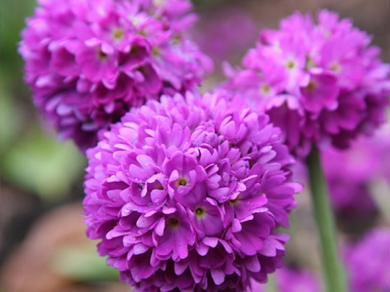 Растение высотой до 30 см, с крупными, морщинистыми листьями. Цветки белого, розового, красного, сине-фиолетового оттенка собраны в шаровидные соцветия на крепких цветоносах высотой 10-15 см. Размножают примулы семенами, делением куста и листовыми черенками. Семена следует высевать осенью в год сбора в открытый грунт. Высаживать примулы надо с таким расчетом, чтобы посадки были сомкнутыми, и между розетками листьев не было открытого пространства, так как растения не любят этого.  На постоянное место высаживают весной или осенью второго года. Молодые растения зацветают на второй — третий год. Цветение примул довольно продолжительно с апреля до конца июня. Хорошо выглядят как в одиночных посадках, так и группами. Красивые плотные соцветия великолепны для срезки.