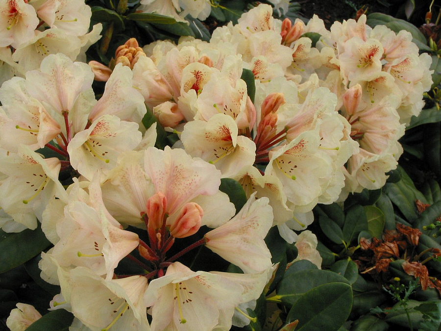 Рододендрон гибридный "Голдбукет" - это великолепное растение с желто-кремовыми цветками, украшенными красным пятнышком внутри венчика. Его зеленая листва радует глаз в течение всего сезона, а его компактный размер (высотой до 100 см и диаметром до 120 см) позволяет разместить его как на газоне, так и в групповых посадках или использовать для создания живой изгороди.